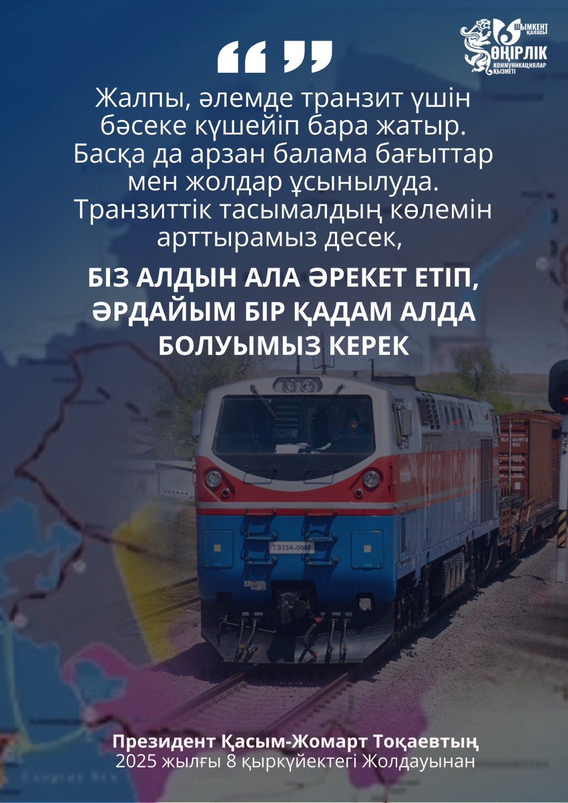 Қазақстан Республикасының Президенті Қасым-Жомарт Тоқаевтың 2025 жылғы 8 қыркүйектегі Қазақстан халқына Жолдауынан: әлемде транзиттік бағыттар үшін бәсекелестік күшейіп келеді. Арзан балама жолдар мен жаңа бағыттар ұсынылуда. Қазақстан бұл жағдайда алдын ала әрекет етіп, әрдайым бір қадам алда болуы қажет. Бұл еліміздің транзиттік әлеуетін арттыруға және халықаралық көлік дәліздеріндегі рөлін күшейтуге ықпал етеді.