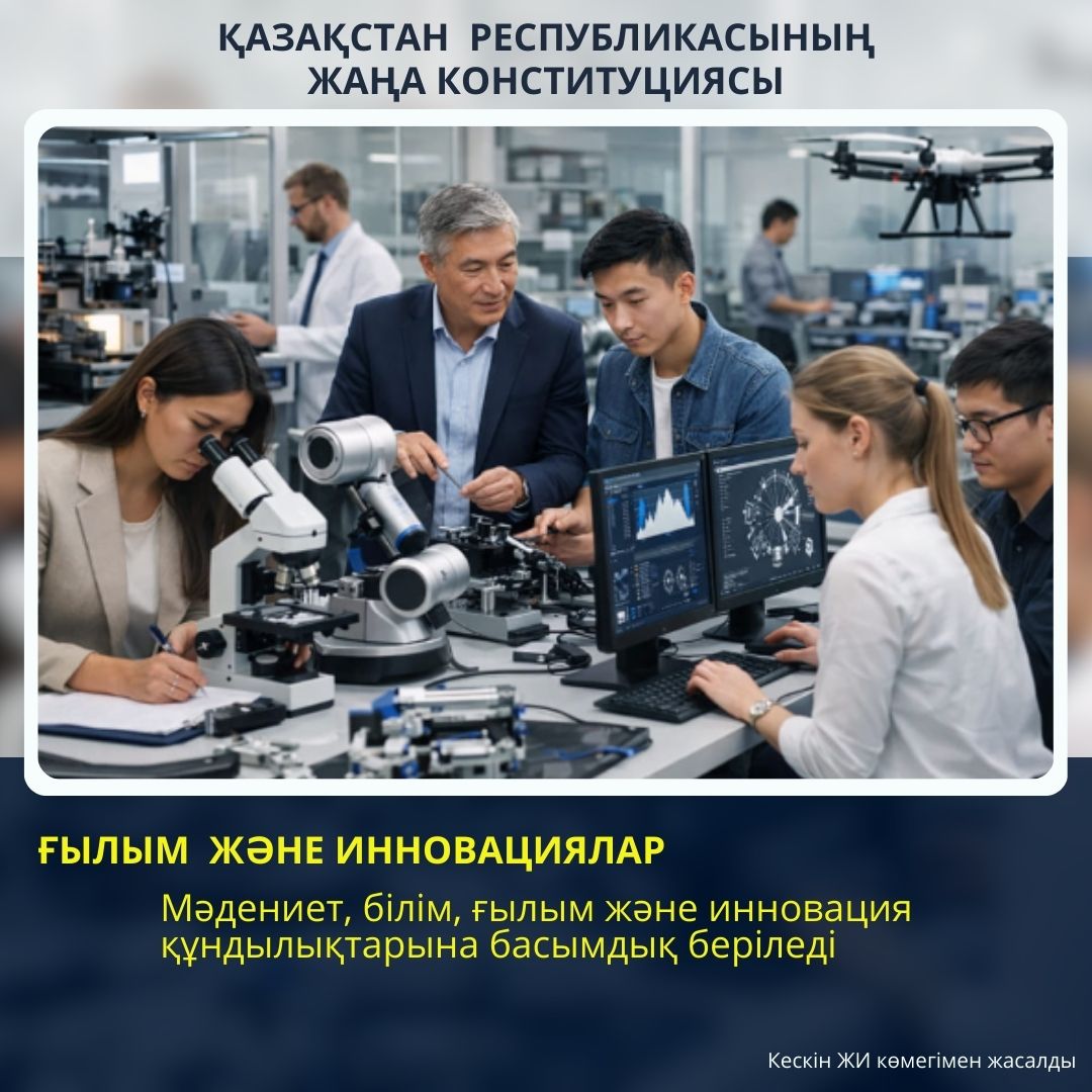 Қазақстан Республикасының жаңа Конституциясында ғылым мен инновацияны дамыту мәселесіне ерекше назар аударылған. Аталған құжатта мәдениет, білім, ғылым және инновация құндылықтарына басымдық берілетіні нақты көрсетілген. Бұл норма еліміздің зияткерлік әлеуетін арттыруға және қоғамның жан-жақты дамуына құқықтық негіз қалыптастырады.