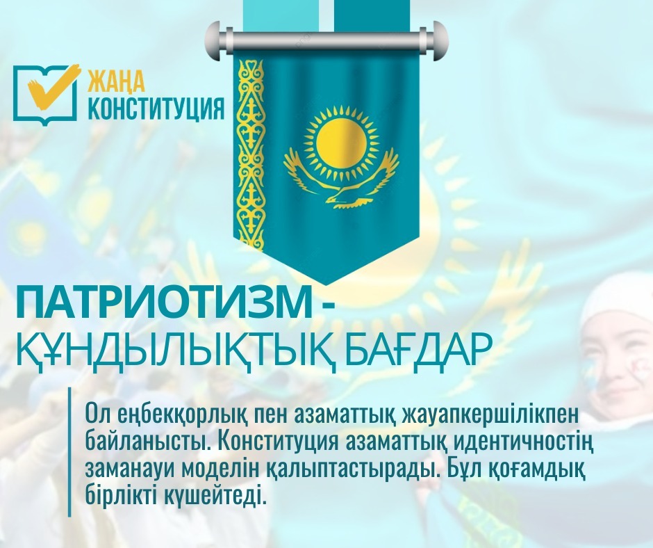 Жаңа Конституция еліміздің азаматтарына патриотизмді тек сөзбен емес, іс-әрекет арқылы көрсетуге үндейді. Патриотизм тек мемлекеттің игілігіне қызмет етумен ғана шектелмей, еңбекқорлық пен азаматтық жауапкершілікпен тығыз байланысты.