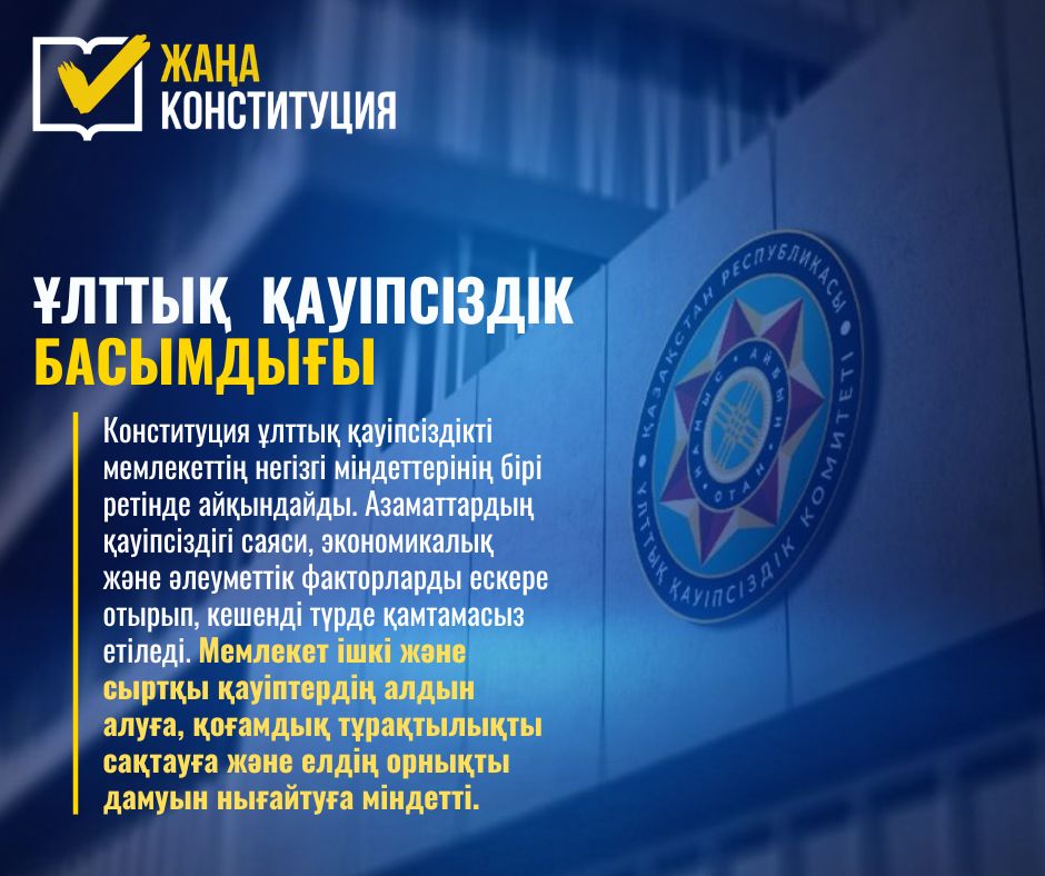 Жаңа Конституция жобасында ұлттық қауіпсіздікті қамтамасыз ету мәселесіне ерекше мән берілген. Негізгі заңда бұл бағыт мемлекеттің басты міндеттерінің бірі ретінде айқындалып, қоғам тұрақтылығы мен ел дамуының негізгі кепілі ретінде қарастырылады.Құжатта азаматтардың қауіпсіздігі саяси, экономикалық және әлеуметтік факторларды ескере отырып, кешенді түрде қамтамасыз етілетіні нақты көрсетілген. Бұл – мемлекет тарапынан қоғамдағы тұрақтылықты сақтау, халықтың әл-ауқатын арттыру және қауіпсіз өмір сүру ортасын қалыптастыру бағытындағы жүйелі шаралардың жүзеге асырылатынын білдіреді.