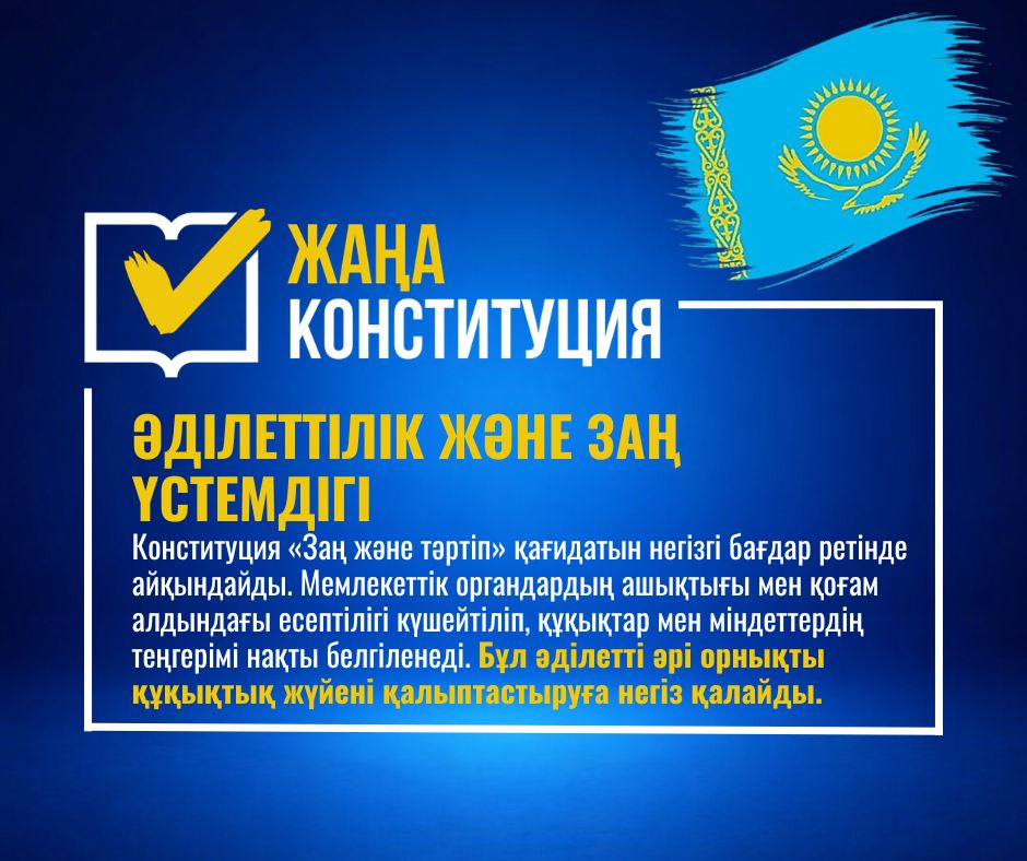 Жаңа Конституцияда көзделген қағидаттар әділетті әрі орнықты құқықтық жүйені қалыптастыруға бағытталған. Заң үстемдігі берік орныққан қоғамда азаматтардың құқықтары сенімді қорғалып, мемлекет дамуының тұрақты әрі әділ негізі қаланады.