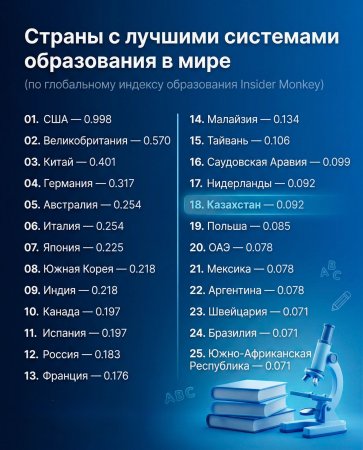 Казахстан занял 18-е место в рейтинге Insider Global Education Index, набрав 0,092 балла и войдя в группу стран с устойчиво развивающимися и международно интегрированными образовательными системами.Позиция в топ-20 отражает системную трансформацию сектора и усиливающееся присутствие страны в глобальном образовательном пространстве. Казахстан опережает Польшу (19-е место), ОАЭ (20-е), а также ряд крупных экономик, включая Мексику, Бразилию и Южную Африку, и конкурирует в плотной группе с Нидерландами (17-е место) и Саудовской Аравией (16-е), которые активно наращивают академическую и научную инфраструктуру.